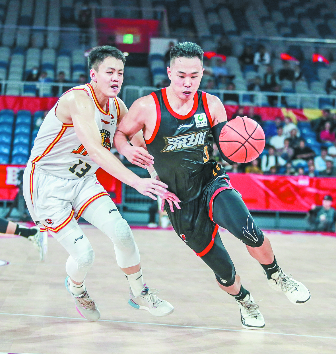 ▲12月5日,深圳马可波罗队球员贺希宁(右)在比赛中带球突破。 当日,在2023~2024赛季中国男子篮球职业联赛(CBA)常规赛第13轮比赛中,深圳马可波罗队主场以113比93战胜吉林九台农商银行队。 新华社发(彭志刚 摄)