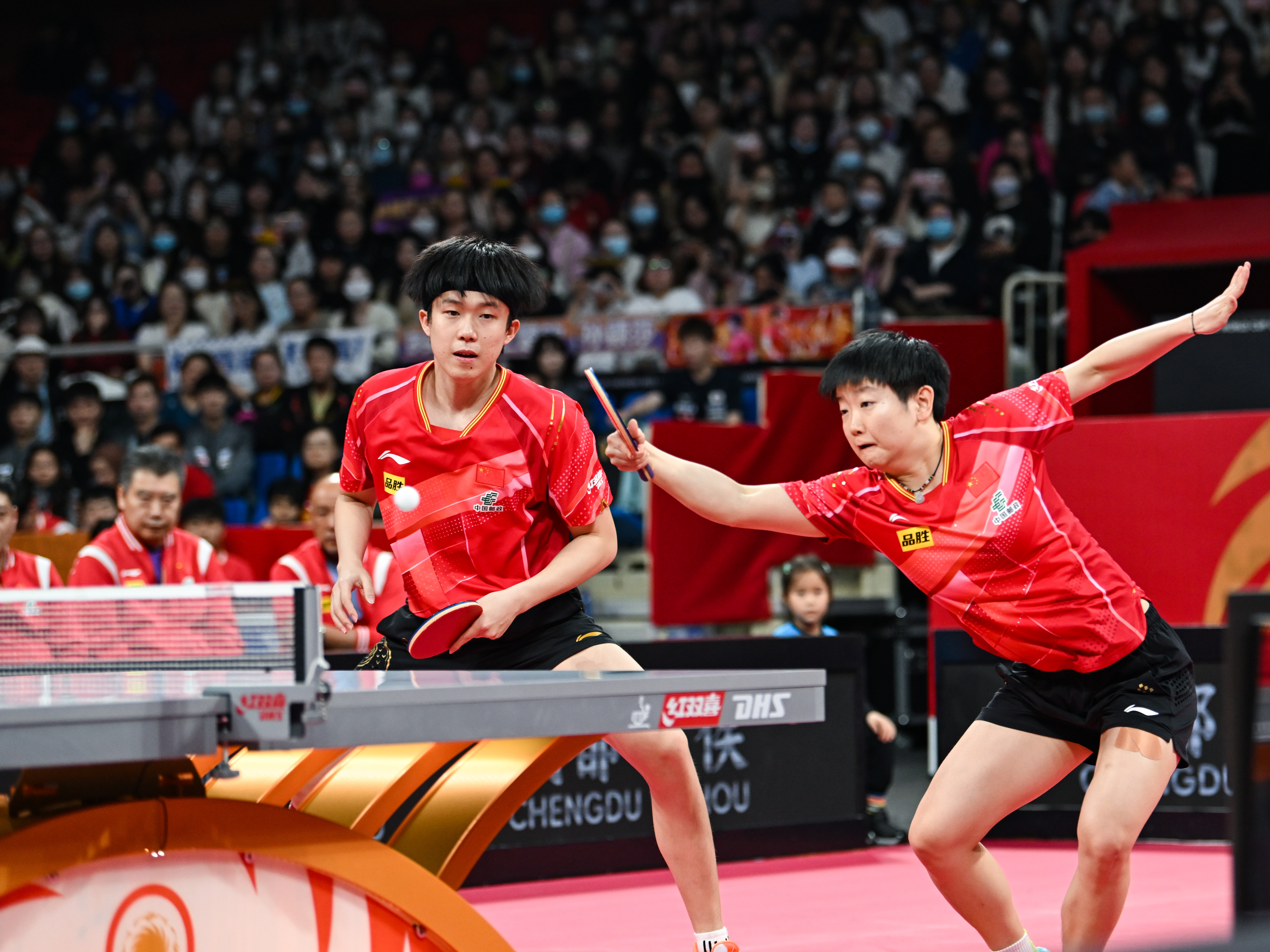 ▲12月7日,中国队选手王楚钦/孙颖莎(右)在混双比赛中。他们以2比1战胜中国台北队选手杨嘉安/李昱谆。 当日,在成都举行的2023年国际乒联混合团体世界杯第二阶段比赛中,中国队以8比1战胜中国台北队。 新华社记者 王曦 摄