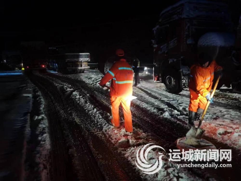当晚10时,平陆境内山区路面、桥梁出现积雪结冰现象,严重影响行车安全,平陆段养护人员连夜行动,采取机械推雪为主、人工融雪为辅的方式交替进行。针对那些已出现路面结冰的陡坡、急弯路段,重点撒布融雪剂和防滑料,双管齐下保证除雪工作顺利完成。