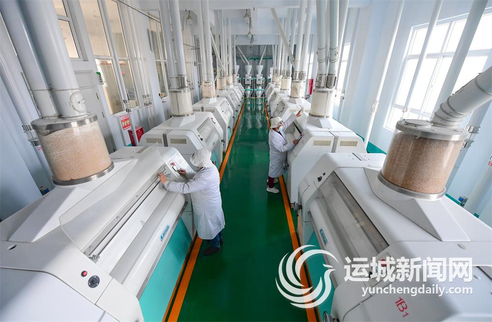 12月12日,在永济市董村农场有限公司面粉分公司生产车间,工作人员在面粉加工生产线上作业。