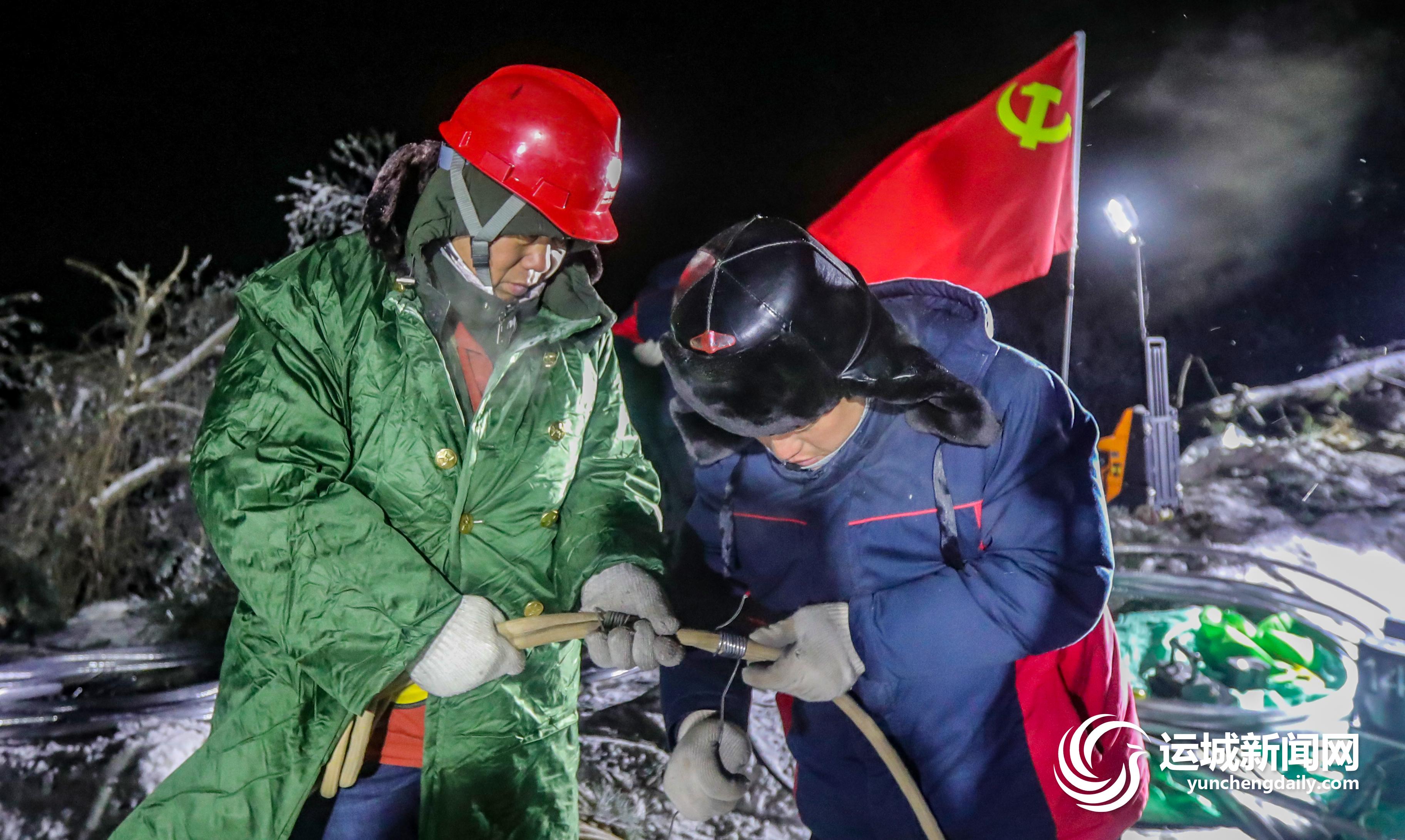 12月15日晚7时,大风,气温零下15℃,220千伏桐垣Ⅰ线抢修现场,工人在进行线缆牵引准备工作。