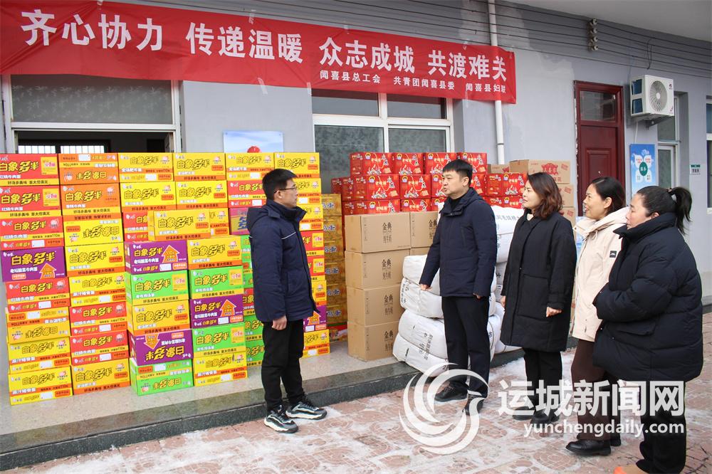 12月15日,在国网闻喜县供电公司后宫供电所大院,闻喜县总工会、共青团闻喜县委和闻喜县妇联三部门工作人员,为参与抢修的电力工人送上慰问物资。