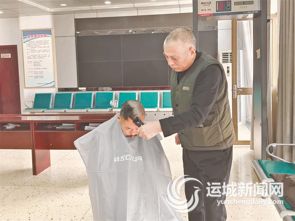 把这名流浪人员接到盐湖区民政局社会救助中心后,工作人员给他准备了饭菜,并帮助他洗澡、理发(上图)。经过两天的接触,这名流浪人员情绪逐渐稳定下来。12月18日上午,任军杰终于问出了这名流浪人员的名字。