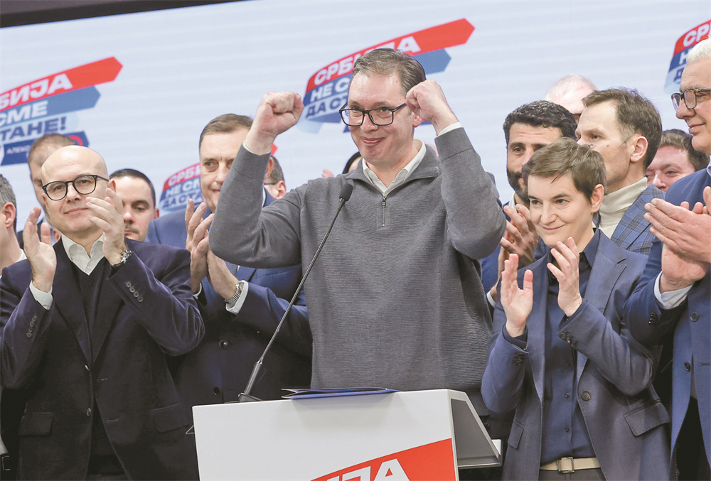 12月17日,塞尔维亚总统武契奇在位于首都贝尔格莱德的塞尔维亚前进党总部宣布,以这一执政党为核心的党派联盟在当天举行的国民议会选举中获胜,赢得独立组阁所需的超半数议会席位。 新华社发(普雷德拉格·米洛萨夫列维奇 摄)