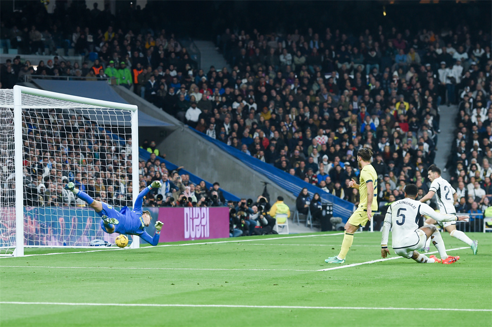 12月17日,皇家马德里队球员贝林厄姆(右二)在比赛中破门。当日,在2023~2024赛季西班牙足球甲级联赛第17轮比赛中,皇家马德里队主场以4比1战胜比利亚雷亚尔队。新华社发