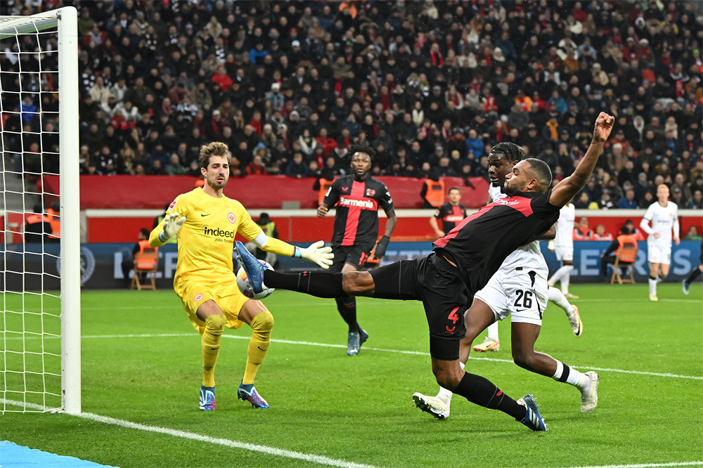 12月17日,勒沃库森队球员塔赫(前右)在比赛中射门。当日,在2023~2024赛季德国足球甲级联赛第15轮比赛中,勒沃库森队主场以3比0战胜法兰克福队。新华社发