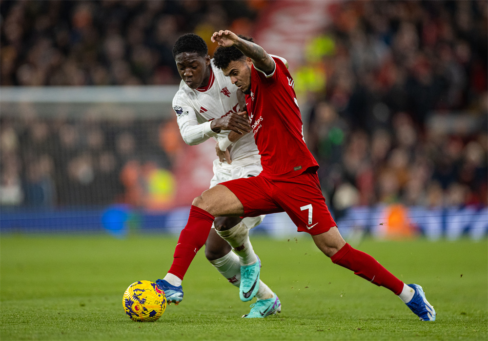 12月17日,利物浦队球员迪亚斯(右)与曼联队球员梅努拼抢。当日,在2023~2024赛季英格兰足球超级联赛第17轮比赛中,曼彻斯特联队客场以0比0战平利物浦队。新华社发