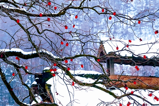 12月17日,雪后初霁,在卢氏县双槐树乡北川村,红彤彤的柿子挂满枝头,把山村农家装扮得美不胜收,呈现出一幅人与自然和谐相生、清新怡人的美丽冬日画卷。 李东阳 摄