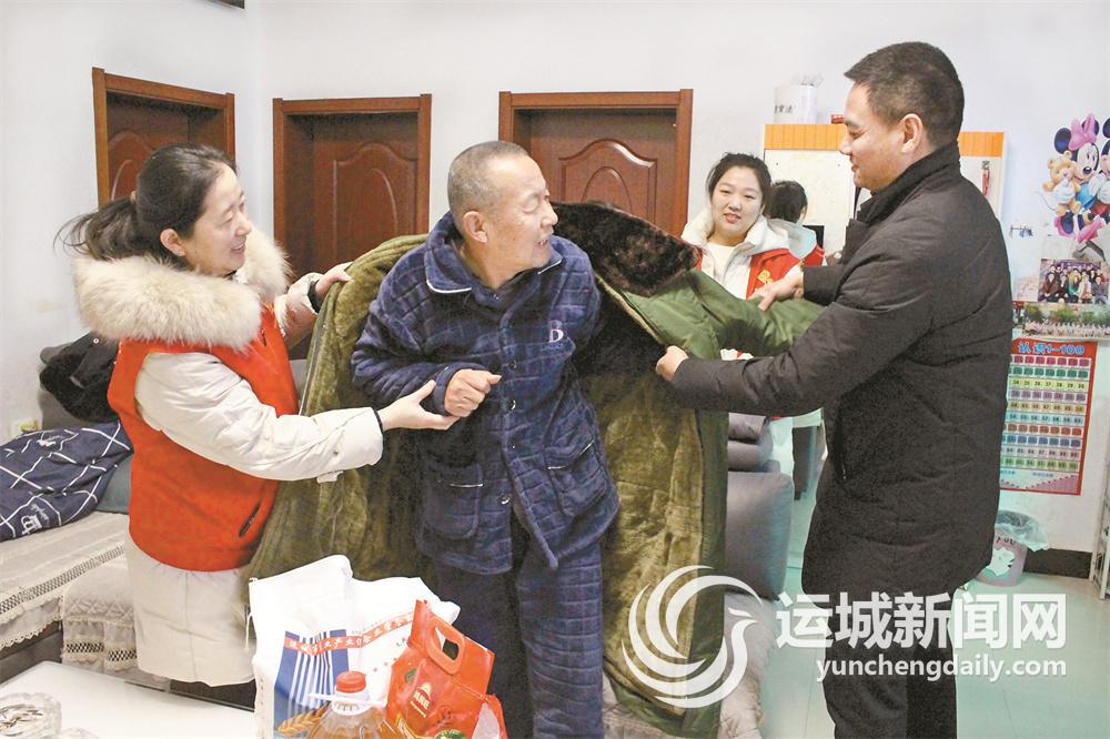 12月21日,闻喜县社区服务中心工业园社区和该县气象局工作人员,为农场佳苑小区困难居民送上军大衣等御寒物品。