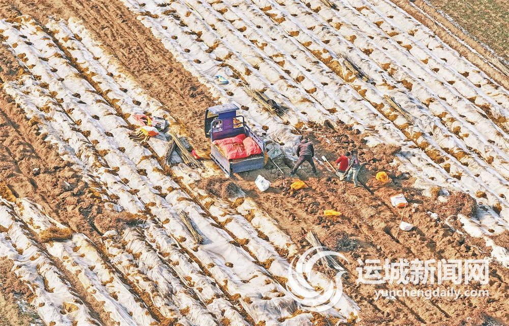 12月20日,新绛县龙兴镇桥东村村民在三泉镇孝陵庄村承包的田间加紧收获山药(无人机照片)。
