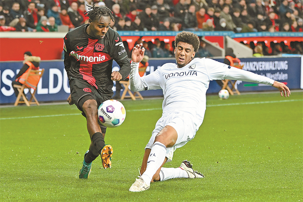 当日,在2023~2024赛季德国足球甲级联赛第16轮比赛中,勒沃库森队主场以4比0战胜波鸿队。 新华社发(乌尔里希·胡夫纳格尔 摄)