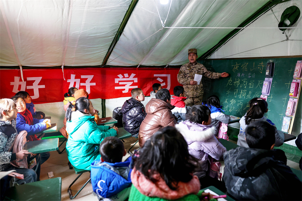 12月23日,在甘肃积石山县刘集乡高李村临时安置点,“武警爱民帐篷学校”的孩子们在上课。