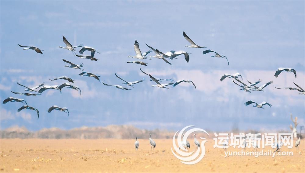 隆冬时节,气温下降,黄河湿地自然保护区河津段迎来越冬灰鹤,它们在河床里或黄河滩地休憩觅食、嬉戏飞翔,给冬日的黄河湿地增添了无限生机与活力。近年来,当地不断加大对黄河流域生态环境的保护力度,来此栖息的灰鹤数量逐年增加。 特约摄影 栗卢建 摄
