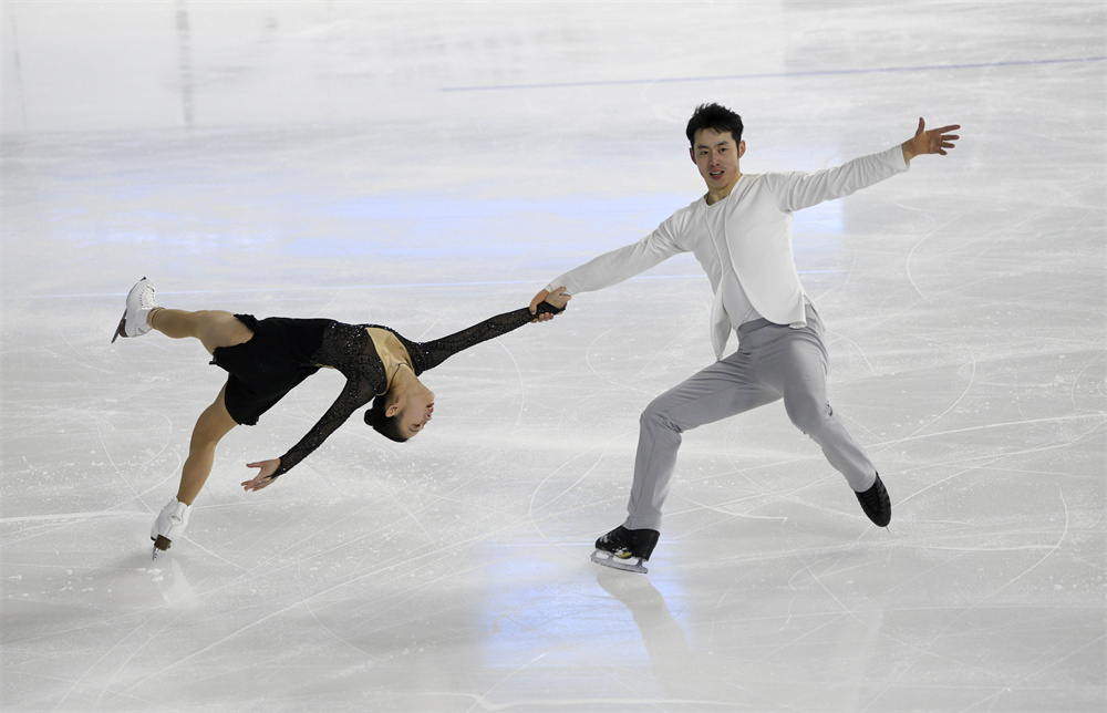12月24日,北京市冬季运动管理中心组合彭程(左)/王磊在双人自由滑比赛中。最终他们以185.30分的总成绩获得冠军。
