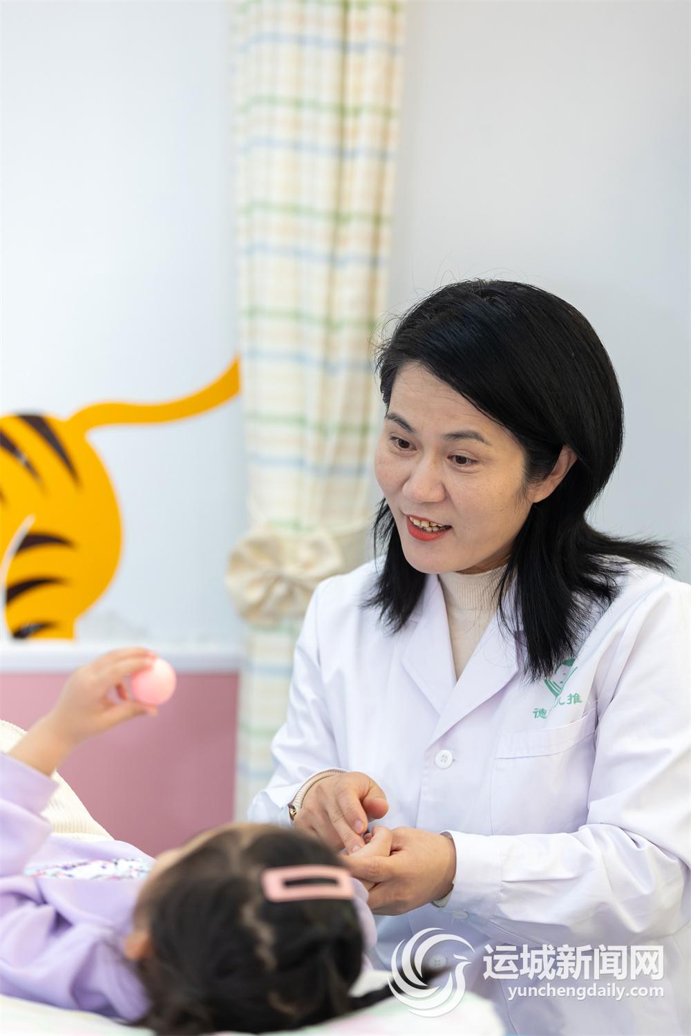 两个吚呀学语的幼儿,穿着单衣裤,光着小脚丫,在按摩床上自在地翻滚,王建红顺势逮住一只小脚,快速推拿,边推边用夸张的表情把小不点儿逗得咯咯直笑,一旁的家长笑逐颜开……