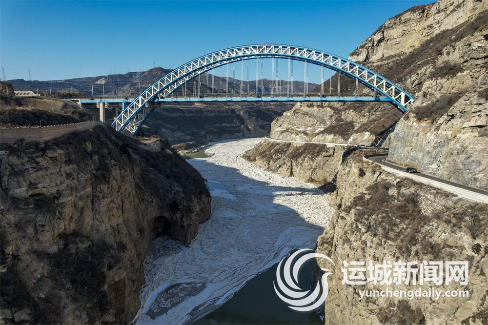 近日,受寒潮天气影响,黄河运城段出现流凌。在黄河河津段石门上游,密集的流凌铺满河道,冰封黄河景观绵延10余公里。航拍镜头下,往日汹涌澎湃的黄河如同翔飞于晋陕峡谷中的银色巨龙,十分壮观。 特约摄影 刘宝成