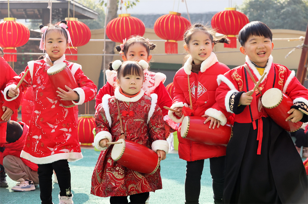 12月27日,浙江省湖州市德清县乾元镇第一幼儿园的孩子们在打腰鼓迎新年。