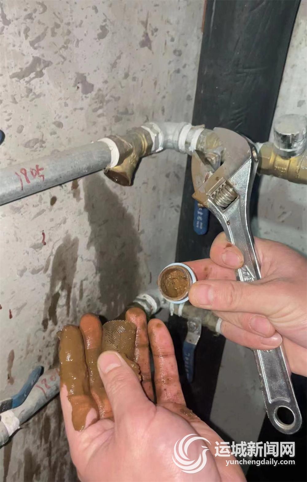 随后,任瑞峰又与同事一起来到市区御溪苑小区20号楼,检查9楼楼道里的供热管道及阀门是否有问题。经检查发现问题出在9楼的总过滤网上,由于久未清洗,楼层供热管道的总过滤网有严重堵塞现象,导致管道内热水流速较慢,整层楼用户家中温度都不太理想,边户家中温度更低。经过与物业多番协商,任瑞峰决定清洗9楼供热管道的总过滤网,从源头上为用户解决问题。