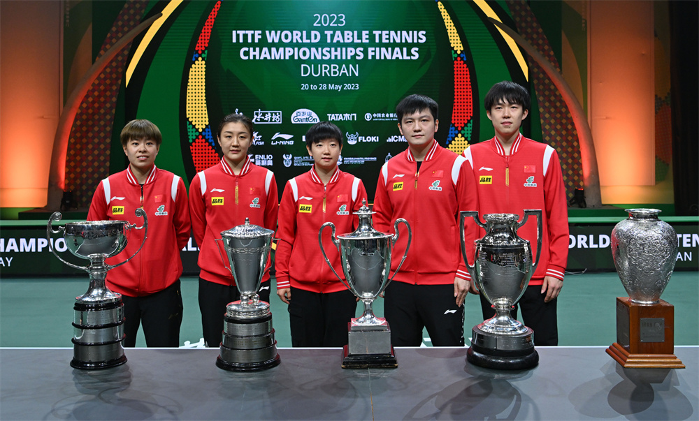 5月20日至28日,世界乒乓球锦标赛在南非德班举行,中国队包揽5个单项冠军,樊振东、孙颖莎分别摘得男、女单打金牌,樊振东/王楚钦为中国队时隔四年重夺男双冠军,陈梦/王艺迪女双登顶,王楚钦/孙颖莎混双卫冕。