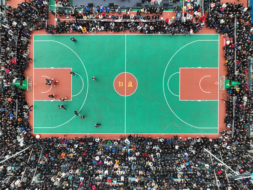 这是2023年3月27日在贵州省黔东南州台江县台盘村拍摄的贵州省首届“美丽乡村”篮球联赛总决赛现场(无人机照片)。