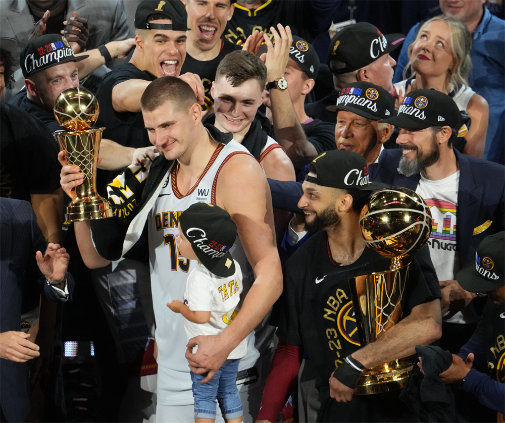 6月12日,在2022~2023赛季美职篮(NBA)总决赛第五场比赛中,约基奇和小波特携手率领丹佛掘金队逆转迈阿密热火队,主场94:89击败对手,以大比分4:1胜出,获得队史首座总冠军奖杯。约基奇当选总决赛最有价值球员(FMVP)。