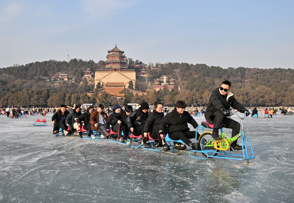 1月1日,游客在颐和园冰场玩冰车和冰上自行车。