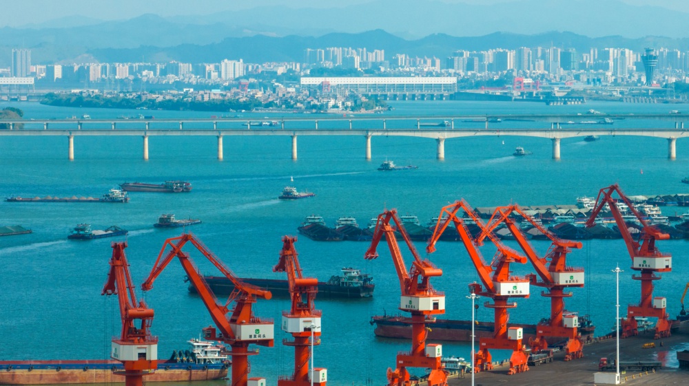 1月3日,在广西梧州临港经济区赤水港码头,工人操作设备在码头上进行装卸作业(无人机照片)。