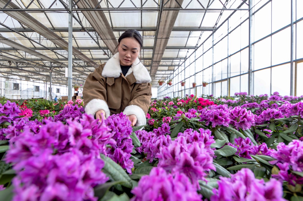 1月4日,村民在贵州省毕节市百里杜鹃管理区汇境花卉基地管护鲜花。新华社发(范 晖 摄)