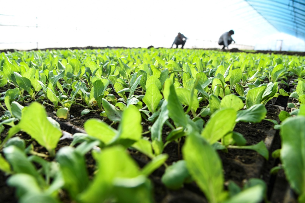 1月4日,河南省济源市轵城镇赵村农民在育苗温棚管护白菜苗。新华社发(苗秋闹 摄)
