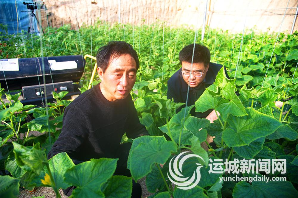 市级农技专家(右)指导大棚乳瓜生产