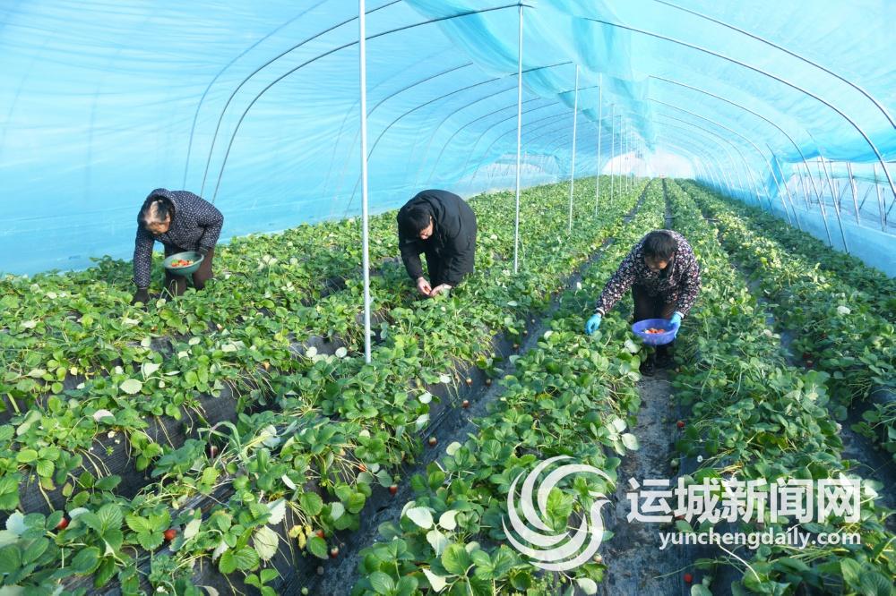 1月5日,游客在闻喜县桐城镇西吴村草莓采摘园采摘草莓。