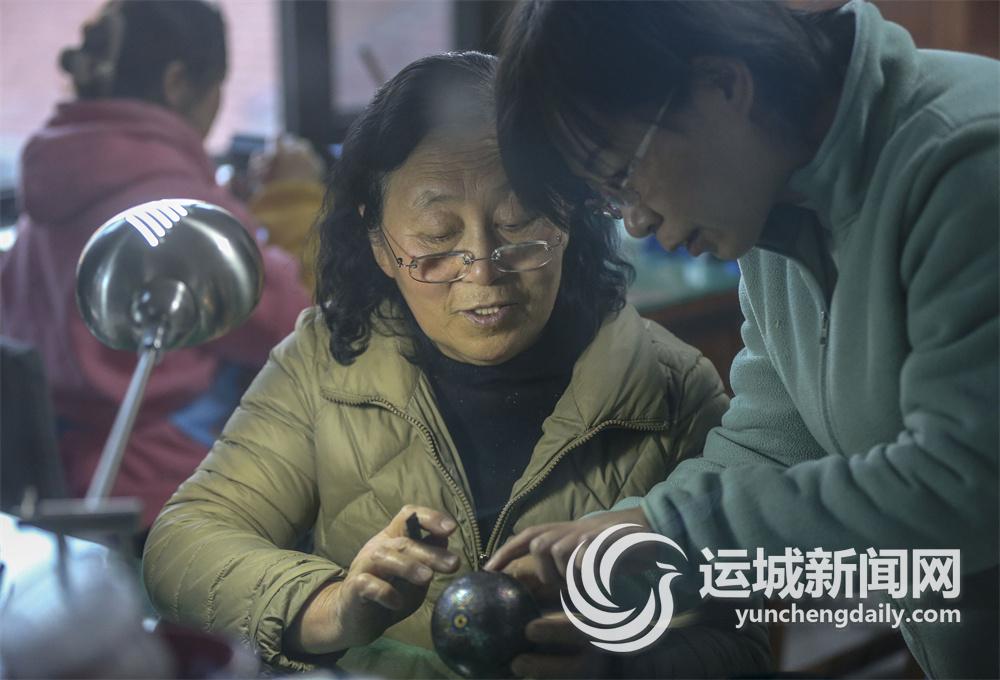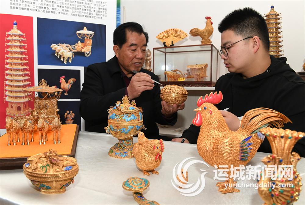 省级非物质文化遗产稷山“金银累丝制作技艺”传承人薛新明(左)在指导年轻人创作金银累丝作品。