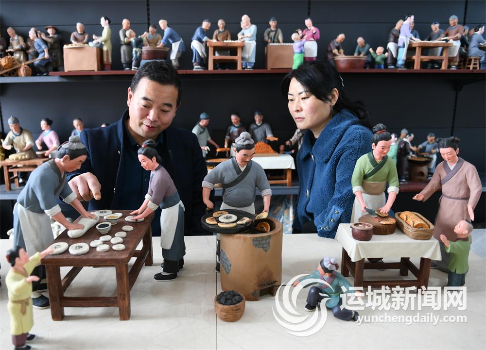 省级非物质文化遗产稷山泥塑传承人梁宏志(左)与妻子采用泥塑制作技艺艺术呈现“稷山四宝”。