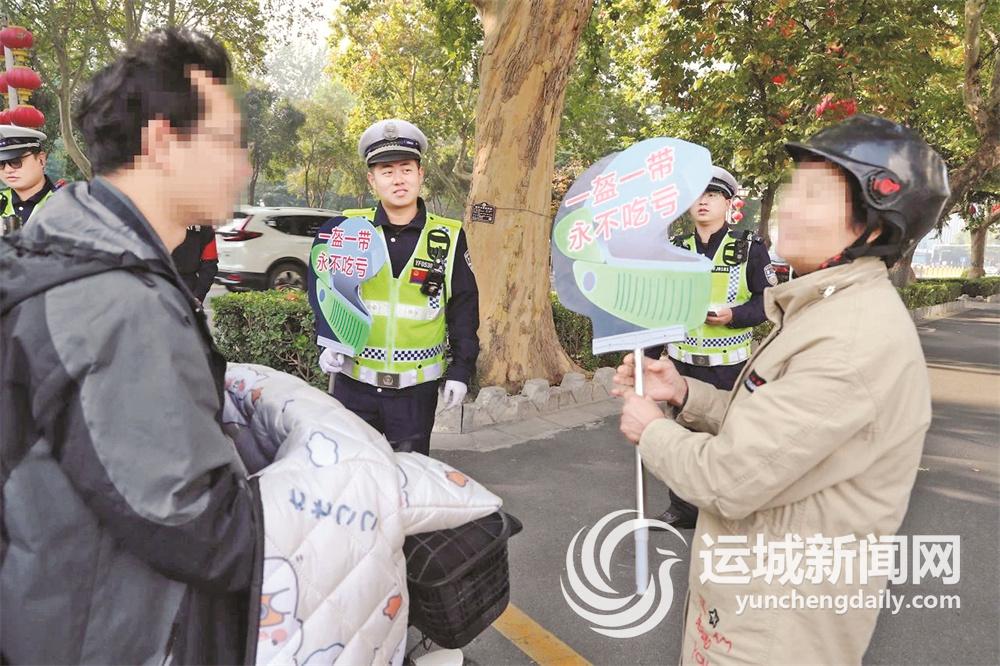 为了查处电动自行车交通违法行为,盐湖交警大队坚持刚柔并济,注重引导管理,推出不戴头盔的“三选一”处罚套餐:罚款20元;观看道路交通安全警示教育片;路面维护道路交通秩序,提醒所有交通参与者遵守道路交通安全法律法规。