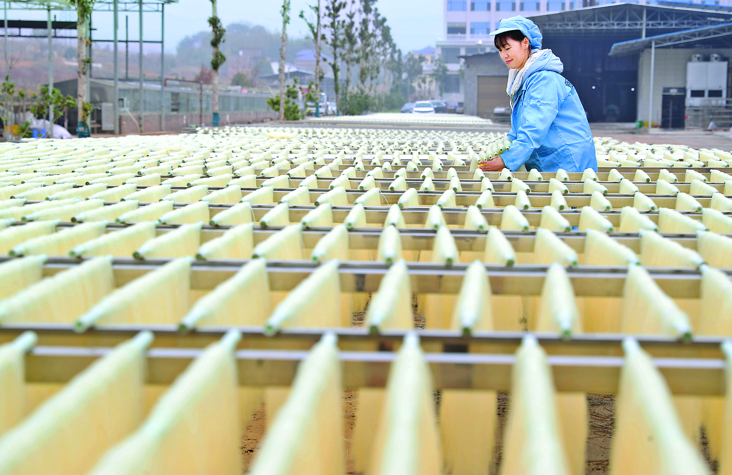 1月17日,在湖南省祁东县黄土铺镇,一家食品企业员工在晾晒粉丝。