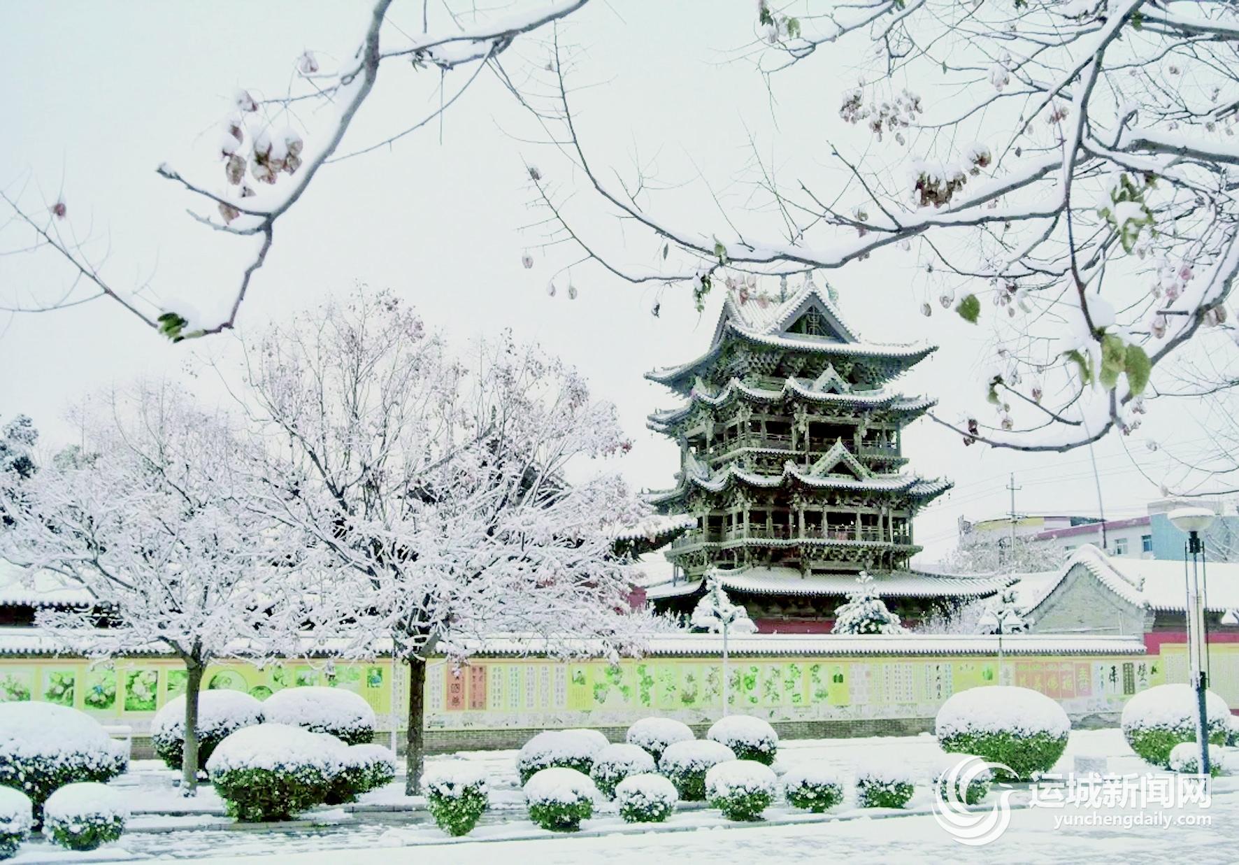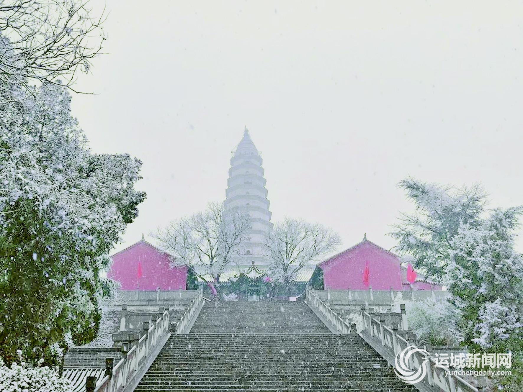 雪天的普救寺莺莺塔若隐若现,诉说着曾经发生于此的美丽爱情故事。