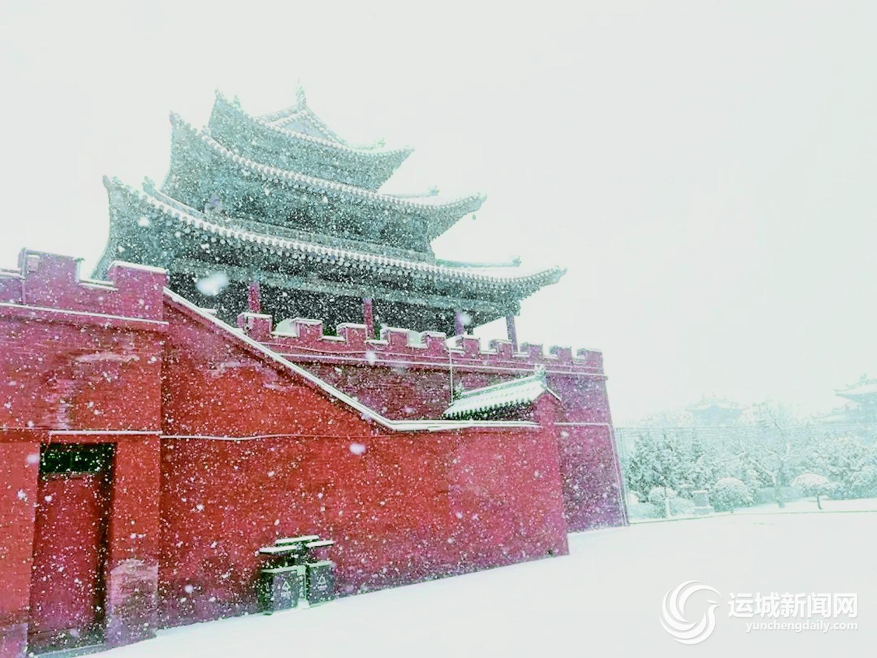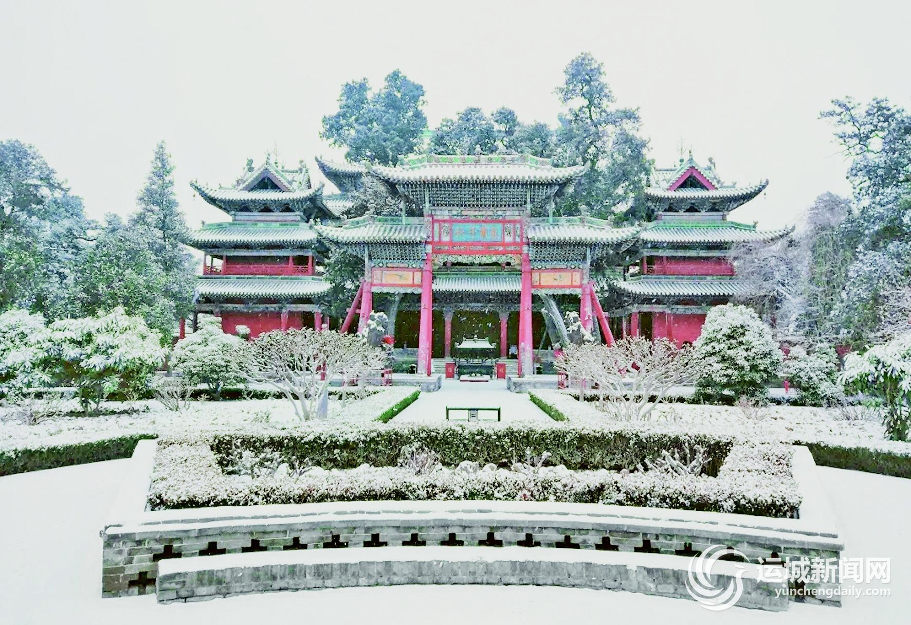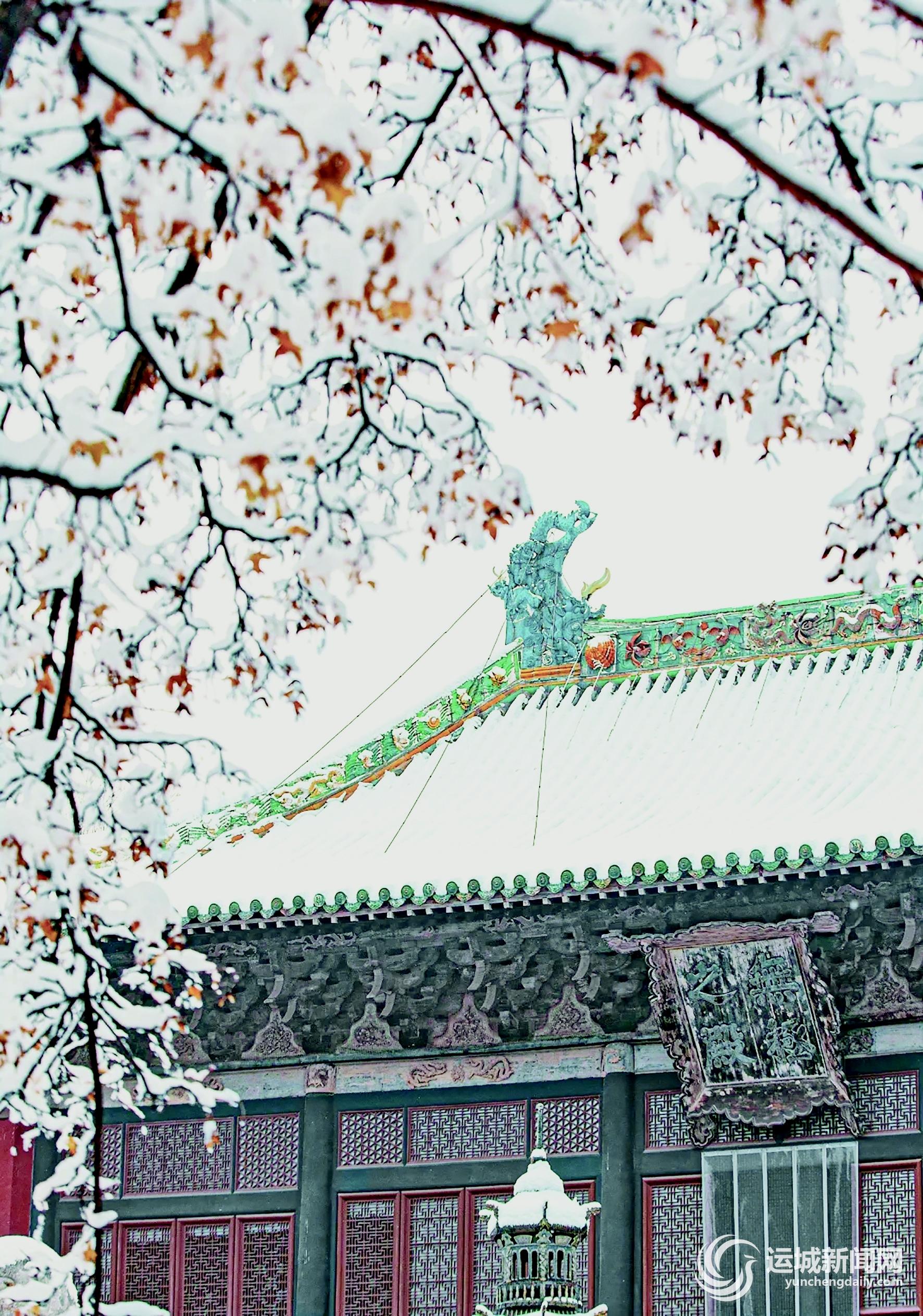 解州关帝祖庙在雪中显得格外庄重肃穆,雪花纷纷扬扬落下,整个庙宇被装点得如诗如画。
