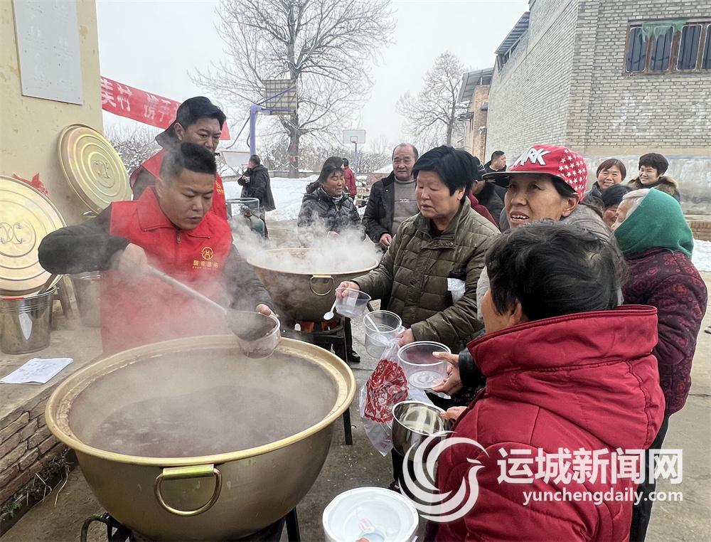 运城晚报讯(记者 薛丽娟 实习生 陈柯邑)1月18日,盐湖区泓芝驿镇店头村后土庙前人头攒动,该村村委会一班人和来自关帝德佑(山西)文化传承有限公司的爱心人士联合举办的腊八节品粥活动正在进行(下图)。