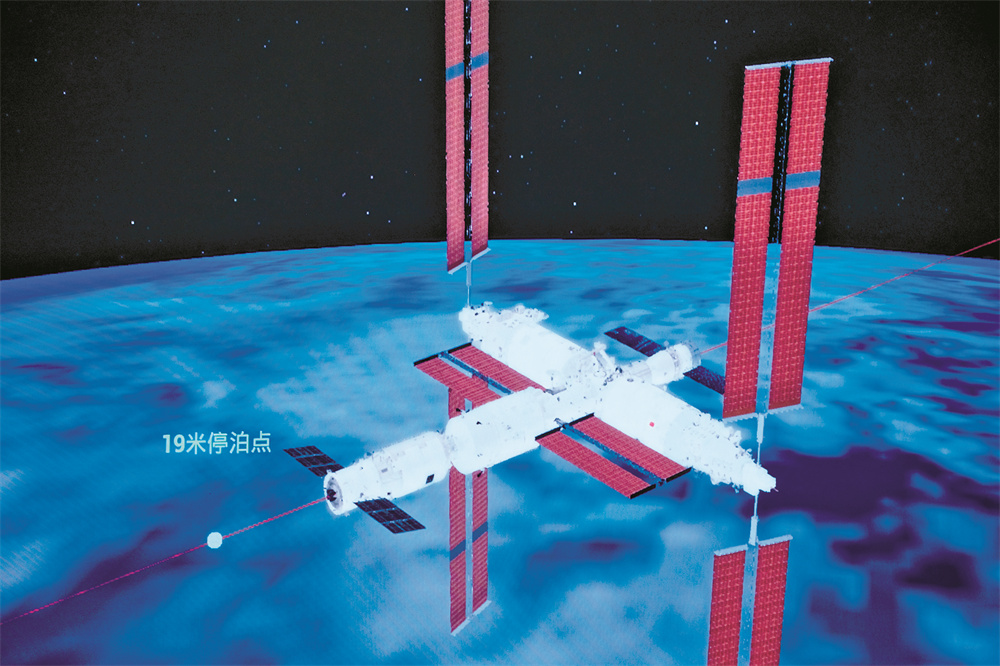 1月18日在北京航天飞行控制中心拍摄的天舟七号货运飞船与空间站组合体进行交会对接的模拟图像。 新华社记者 李杰 摄