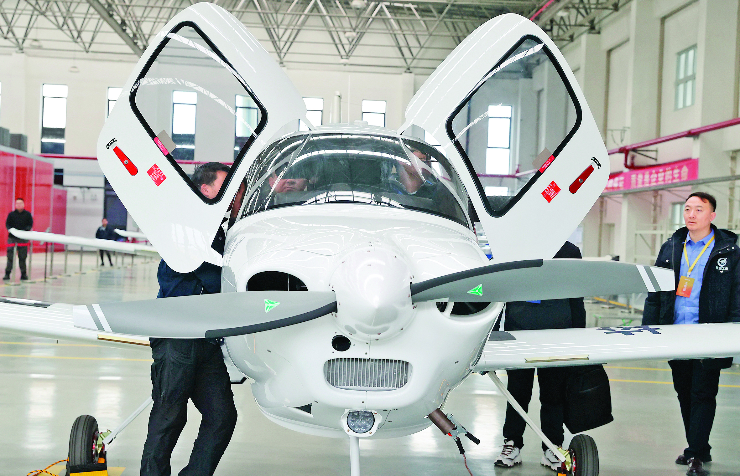 当日,由航空工业通飞自主研制的新一代初级教练机领雁AG100首批飞机在浙江省湖州市莫干山高新区临杭产业新区下线交付,标志着领雁AG100飞机正式进入市场。新华社发(谢尚国 摄)