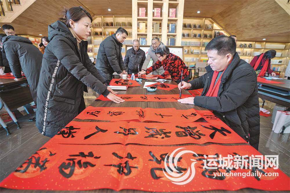 1月22日,志愿者在运城经济技术开发区鼎鑫华府社区义务为群众写春联。龙年春节临近,我市组织志愿服务队走进社区,开展“书春送福”公益文化活动,为群众送上节日祝福。