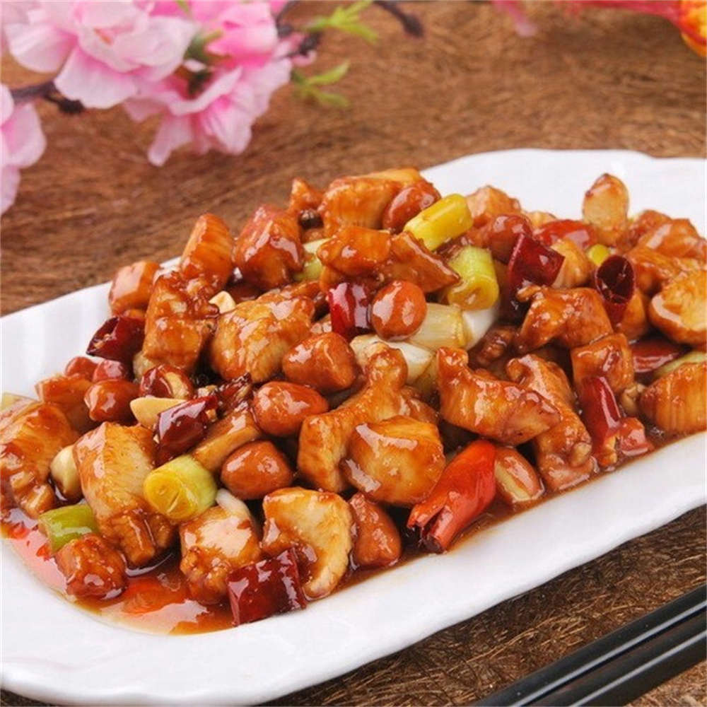 7.放入鸡丁炒散,加入蒜片、姜片、葱段,炒出香味,加入芡汁炒匀。最后加入炒香的花生米炒匀即可。