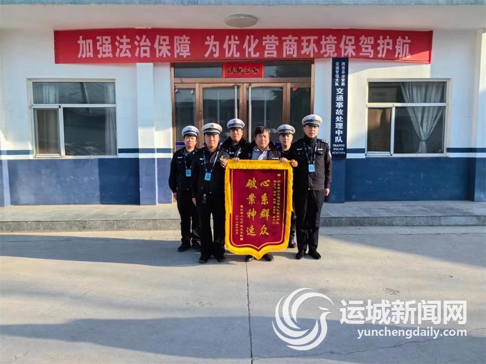 运城晚报讯(记者 刘凯华)近日,闻喜居民杨先生带着一面印有“心系群众 破案神速”的锦旗来到闻喜交警大队事故中队,对该中队快速破获肇事逃逸案表示感谢(下图)。