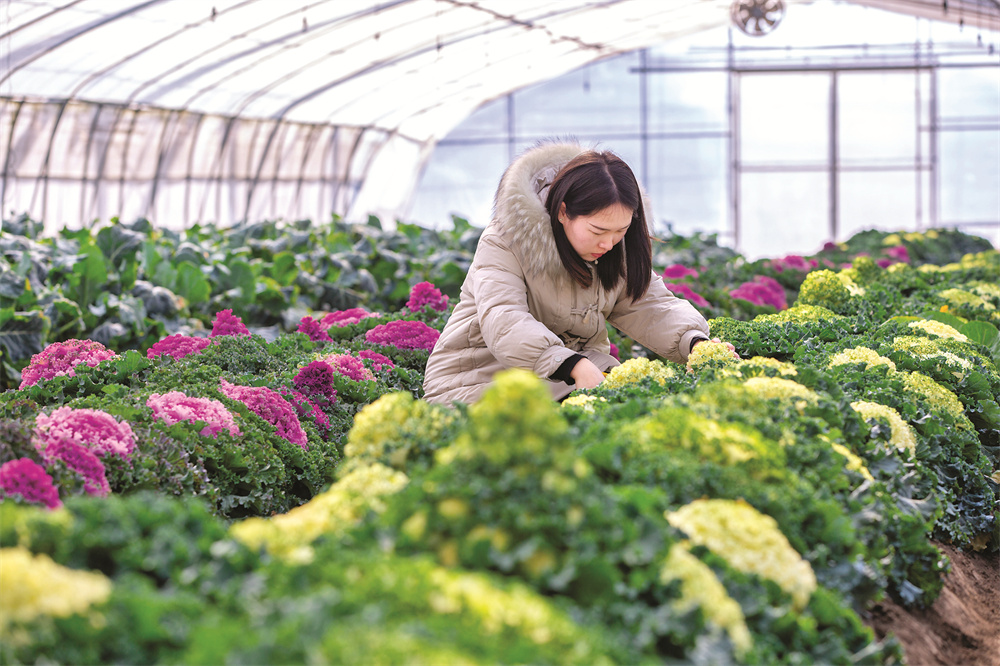 1月24日,农民在江苏省扬州市江都现代农业产业园蔬菜大棚内采摘羽衣甘蓝。