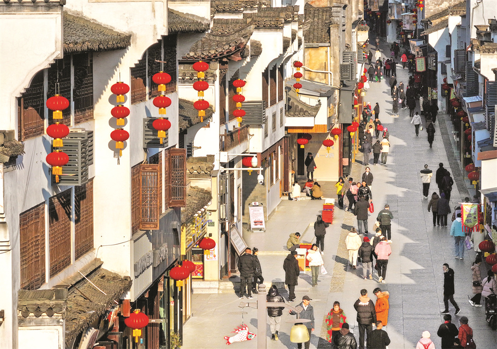 春节临近,安徽省黄山市歙县徽州古城挂起串串大红灯笼,洋溢着喜庆红火的节日氛围。 新华社发(施亚磊 摄)