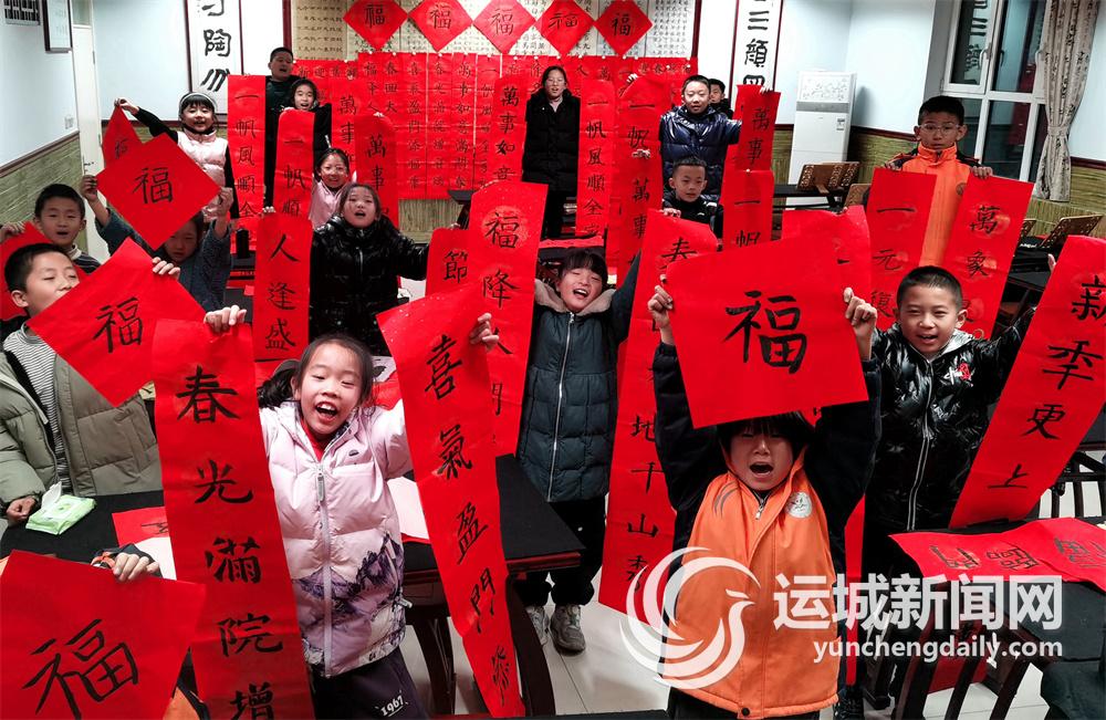 近日,万荣县实验小学组织学生开展“写春联 迎新春”活动,在喜迎传统佳节的同时,让学生感受中华优秀传统文化的魅力。图为学生在展示自己书写的春联。