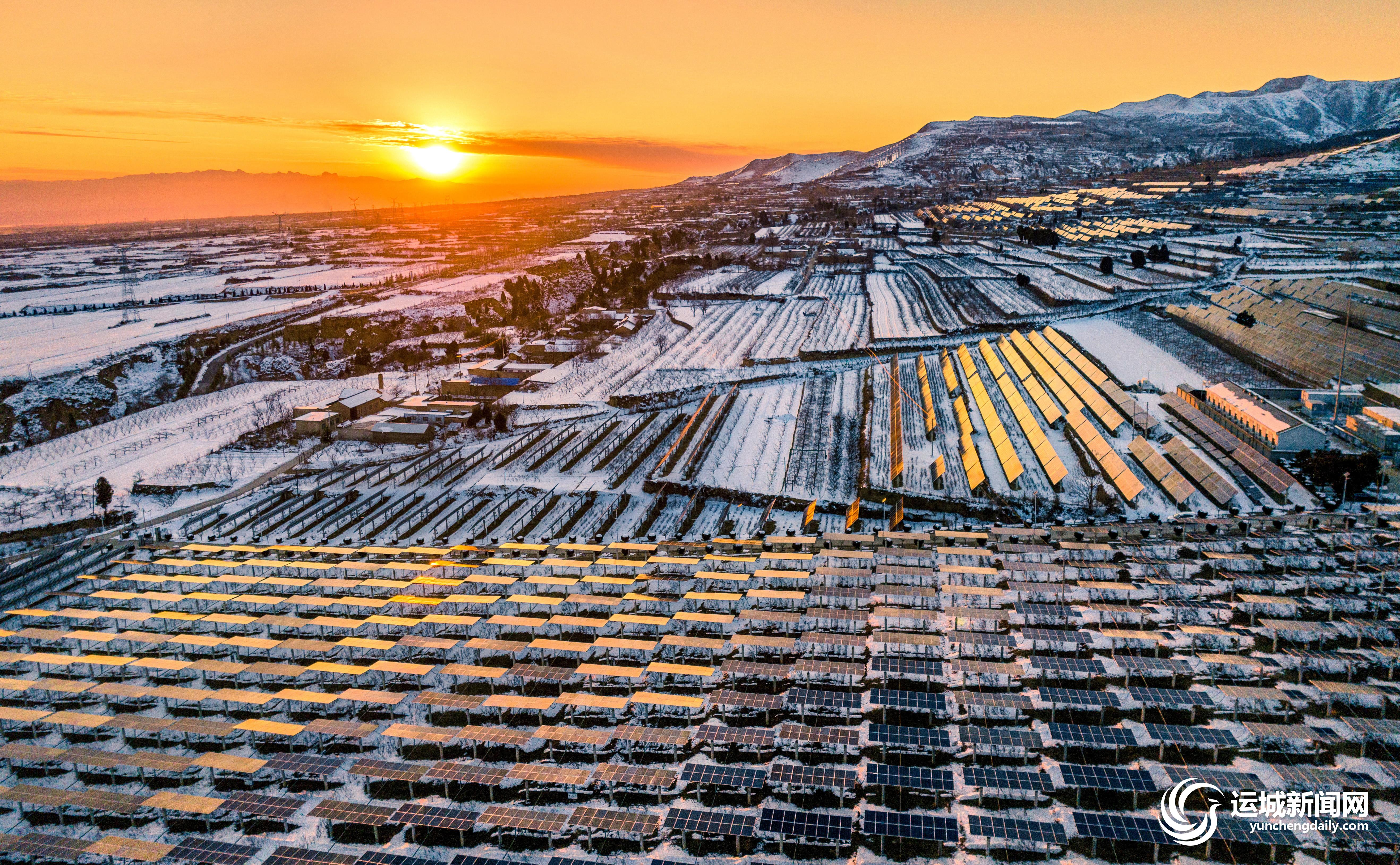 ▲近期,由于降雪影响,在芮城县光伏领跑技术基地上,蓝色的太阳能光伏板与美丽的夕阳、白雪皑皑的中条山交相辉映,绘就了一幅光伏基地雪景画卷,美不胜收。