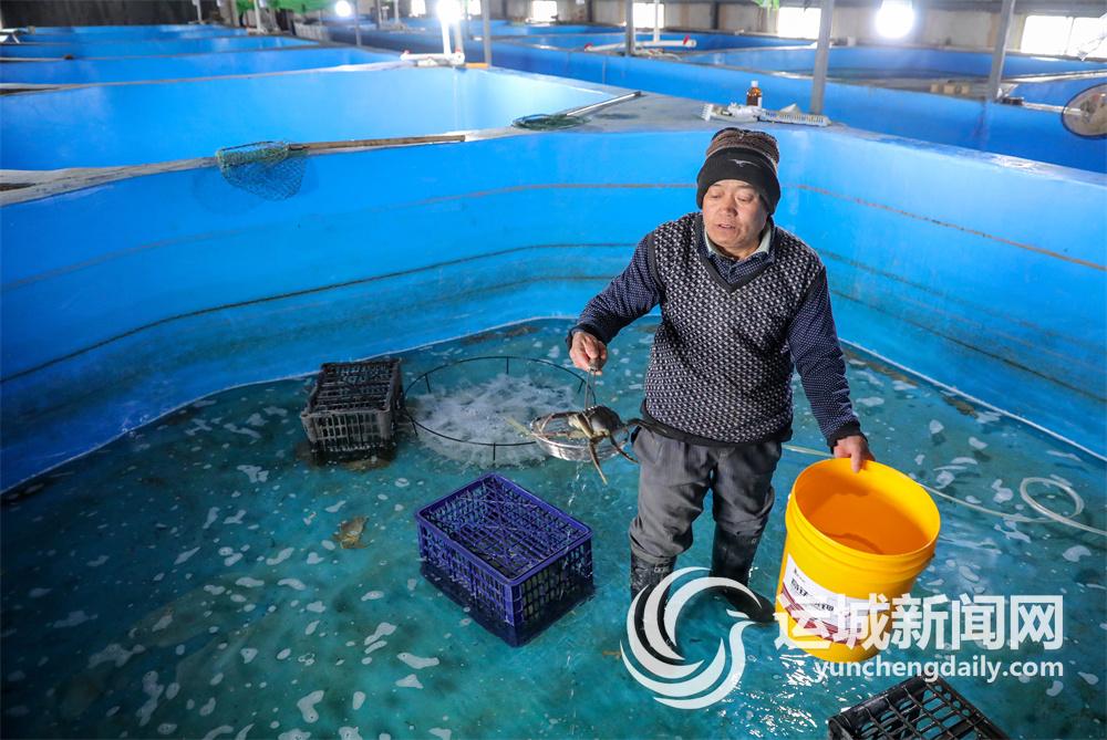 薛公滩大闸蟹养殖户在室内养殖池捕捞大闸蟹。记者 金玉敏 摄