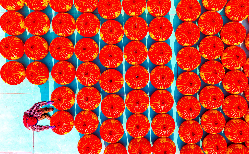 1月28日,在江苏省海安市墩头镇毛庄村一灯笼作坊,村民在赶制大红灯笼。