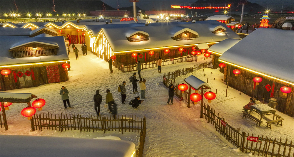 1月26日,游客在河北省遵化市山里各庄的山庄雪乡景区游玩(无人机照片)。